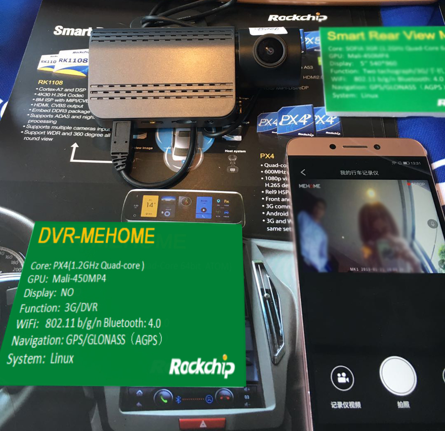 Rockchip高阶PX4车联网方案,四核处理器,Mali-450GPU,助力车联网产品全面升级。本次展出了搭载PX4方案的行车记录仪,基于Linux系统,支持前后1080P+720P双录、网络在线直播、Wifi无线透传,时延200ms内、BT4.0抓拍按键、GPS轨迹追踪、优秀的功耗控制;可通过手机APP观看实时或录制影像。