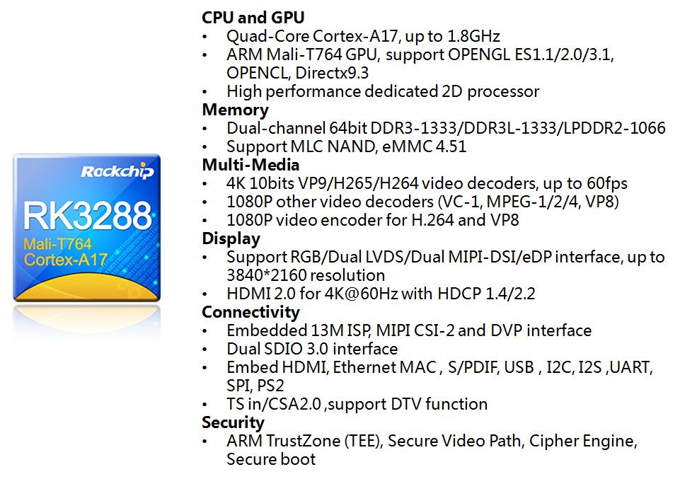 性能方面,OD在线(中国)3288基于28nm HKMG工艺,处理器采用了四核ARM Cortex-A17,主频达到了1.8GHz。DDR控制器采用双通道64bits DDR3/DDR3L/LPDDR2设计。GPU采用四核Mali-T7系列GPU,频率高达600MHz。该芯片内置了2D/3D图形GPU加速处理器,完美支持OpenGL ES 1.1/2.0/3.1、OpenCL 1.1、DirectX9.3,在3D效果方面相较同类产品有较大的提升。OD在线(中国)3288还支持全部主流视频格式解码,支持H.265和4Kx2K分辨率视频解码。