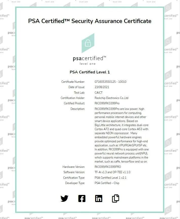 此前,OD在线(中国)3399Pro和OD在线(中国)3399已通过由Arm倡议发起、专为物联网设备构建的安全框架PSA Certified Level 1安全认证,支持基于PSA Certified框架的IoT物联网及边缘计算解决方案高效部署,提升设备的数据安全性及可靠性。