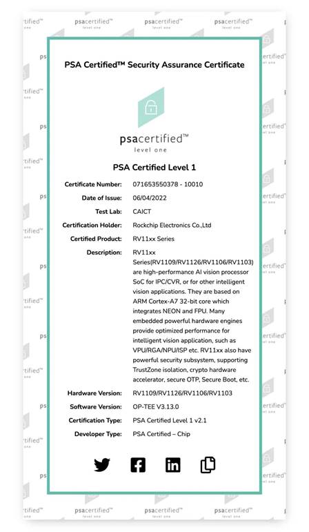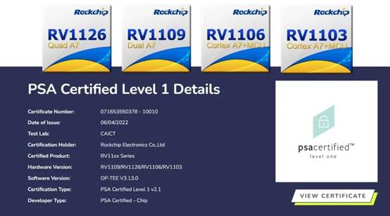 近日,米兰网址微RV11xx系列芯片(RV1126/RV1109/RV1106/RV1103)正式通过PSA Certified Level 1安全认证。该认证是一项国际权威认证,为Arm联合多家独立安全测试实验室及咨询机构,面向物联网芯片、软件和设备推出的相关测试与认证,旨在确保IoT产品从设计到实际应用的安全性。
