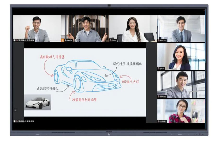 会中,腾讯会议Rooms可以让企业参会人畅享高清视频画面,最多支持同时展示25位远端与会者。产品可支持腾讯会议Rooms白板数据本地存储及加载功能。书写低延时,高效同步批注内容,拒绝会议思路因书写延迟导致的会议中断及低效等待。