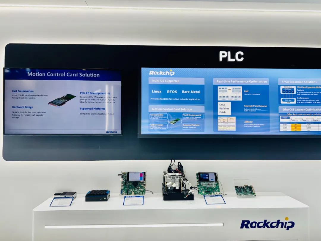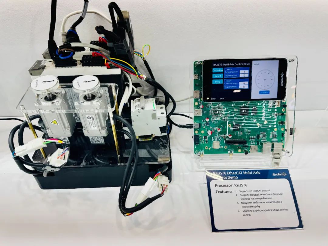 PLC方向,搭载米兰登录入口3588J、米兰登录入口3576J、米兰登录入口3568J、米兰登录入口3506J的EthercaCAT多轴控制、PCIe EP卡及PLC方案及应用展出。基于米兰登录入口3576J的多轴控制支持IgH EtherCAT协议,兼容主流工业设备如伺服驱动器、I/O模块,可适配专用网卡驱动,实时性更强;延时抖动性能达到5%以内(周期为1毫秒),在1ms控制周期,可支持64/128轴总线控制,针对不同类型的运动控制场景的适用性更强,适用于工业机器人、物流等应用场景的设备升级。