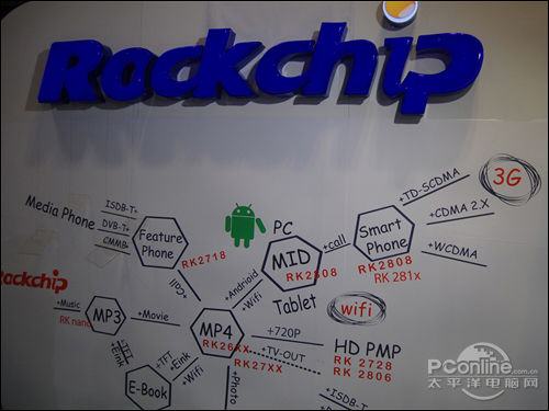 Along with the perfect annotation of the conception , the product is what actual in the customer's hand. Rockchip is bringing us many surprises.In the Hongkong exhibition ,Rockchip launchs the first Android terrace mature solution and displays the Smart Phone (Android +3G+720P),iMID(mobile internet terminal within 5 inches screen ) ,3G MID (with 3G SIM card mobile internet terminal inside), tablet PC(stronger embodied mind ,the China chip iPad ),PC(stronger handling and portable PC ), wireless digic rahmen (new generation tablet rahmen applied by the internet & software ),E-book (PVI E-ink screen, AUO electronic screen/LCD color screen,support Android) etc.