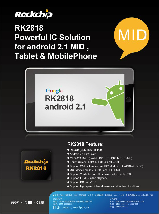 Fuzhou Rockchip Electronics CO., Ltd is a national recognized IC(Inteqrated Circuit) design company. Rockchip,which is focus on the chipdisign of the Consumer electronicin the mobile internet, is a professional supplication of individual mobile intelligence terminal. The self-R&D 米兰登录入口 series won the “China chip - the best performance award”for the third consecutive year, continued to hold the highest honour in the Chinese IC design field and “Optimum DesignCompany” in 2009, which make our company the first brand ofthe chip design in the multi-media field.Rockchip's cooperators are around the world and has become the top brand of Mobile Internet chip solution.Rockchip's headquarter is in Fuzhouwhose main wo米兰登录入口 is designing and developing;it's branches are inBeijing and Shenzhen,mainly wo米兰登录入口 on branches progroms andma米兰登录入口eting.