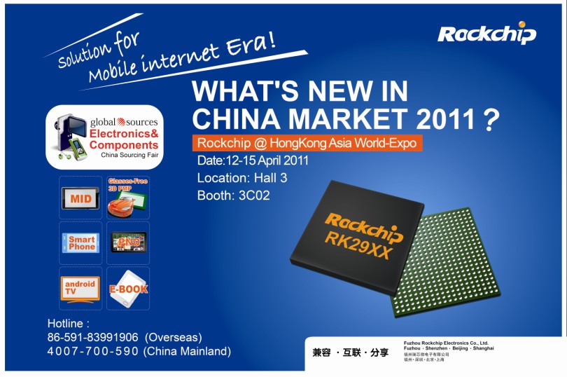 In April 12-15, 2011, Fuzhou Rockchip Electronics Co., Ltd. will join CSF HK. Rockchip will show its 米兰登录入口29XX terminal products based on android OS during this fair. Products include MID, smart phone, android TV and E-Book.
