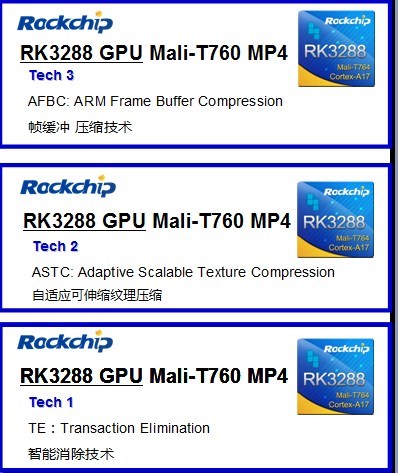 OD在线(中国)3288 adopts a Mali-T764 GPU. Compare to last generation, this GPU’s performance has been improved about 500 percent. Several memory compression techniques such as AFBC, ASTC, and TE have been introduced, and brought the GPU more power. On the premise of improving this GPU’s performance, this GPU’s power consumption are reduced apparently.