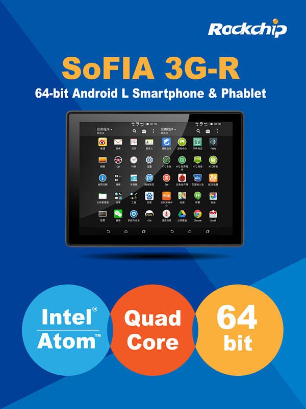 Rockchip and Intel have jointly launched the 64bit quad-core 3G communication solution SoFIA 3G-R at 2015MWC on March 2. SoFIA 3G-R is Rockchip’s first integrated communication platform for entry level and cost effective tablets, phablets, and smartphone. Smartphones and phablets based on SoFIA 3G-R have been shown to the public for the first time.